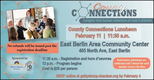 The Chamber of Gettysburg & Adams County supports and strengthens our members and the Adams County area by promoting diverse economic opportunities through advocacy, building relationships, providing timely information and developing leaders for the future.