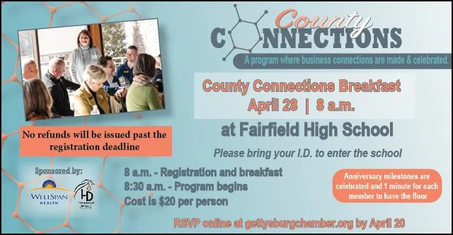 The Chamber of Gettysburg & Adams County supports and strengthens our members and the Adams County area by promoting diverse economic opportunities through advocacy, building relationships, providing timely information and developing leaders for the future.